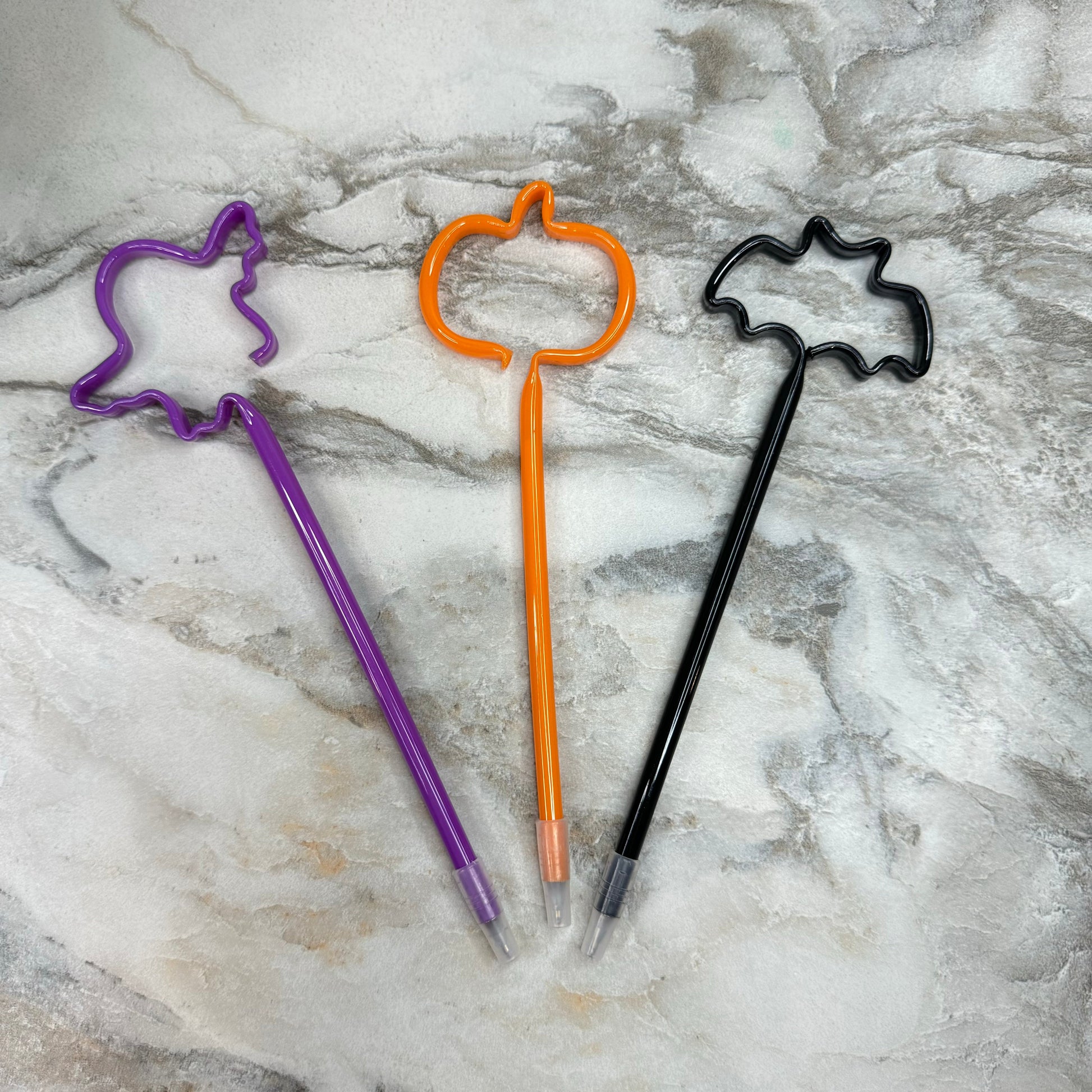 Random selection: purple ghost, black bat, and orange pumpkin.