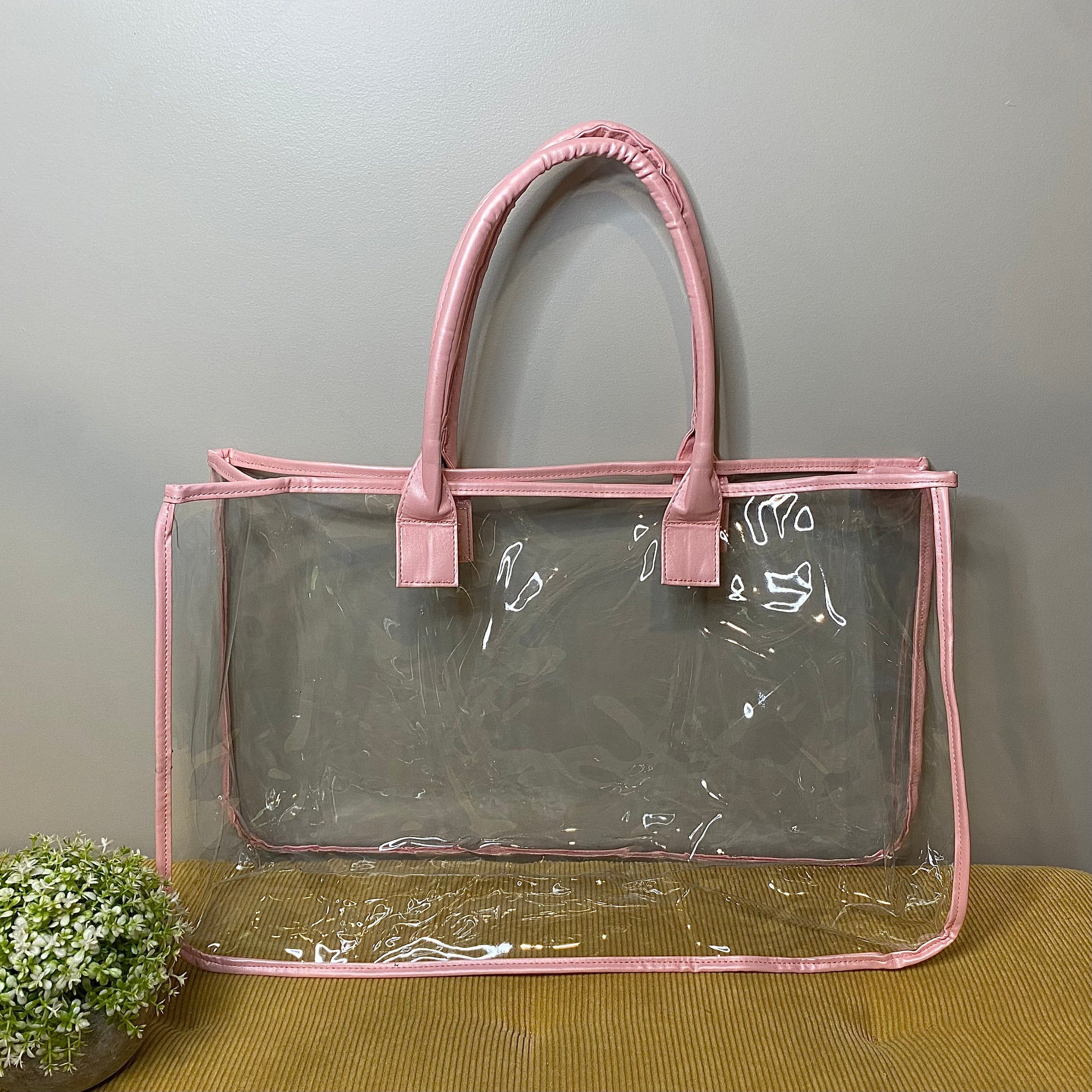 Clear plastic material with faux leather trim and handles.